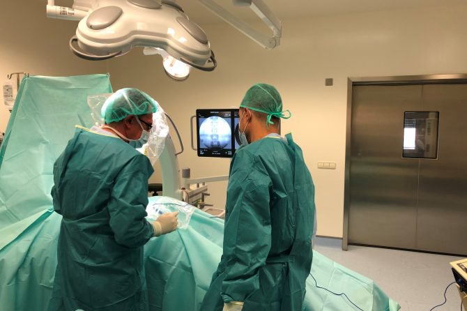 Emillio Bronte y Alejandro Rabanal, de la Unidad del Dolor del centro médico, fueron los encargados de intervenir a una joven con esta técnica innovadora que pasa por estimular las raíces posteriores de la médula espinal.