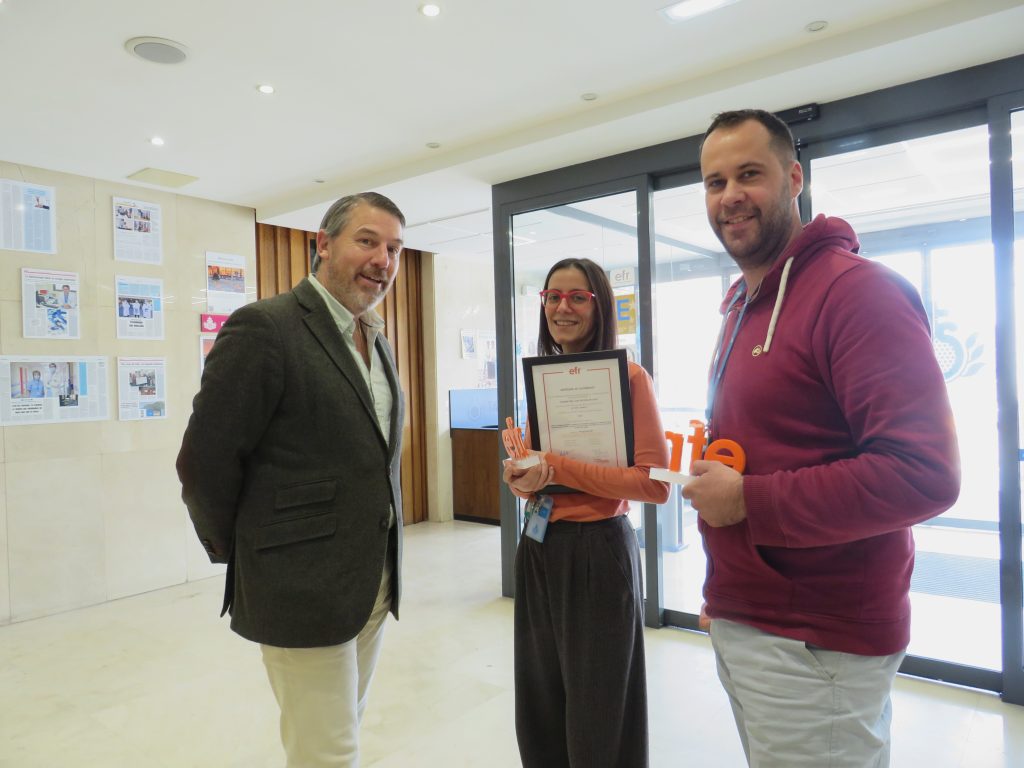 La directora de Personas y Valores, Mónica Redondo, acompañada por Jon Pascual, manager ‘efr’ del centro, ha recogido de manos del director general de la Fundación Másfamilia, Rafael Fuertes, un reconocimiento avalado por el Ministerio de Derechos Sociales, Consumo y Agenda 2030 que, en sus propias palabras, “mide una huella social”. “Que una empresa ponga a sus empleados en primer lugar significa que les pregunta por sus necesidades y expectativas y, sobre todo, las gestiona”, ha subrayado.