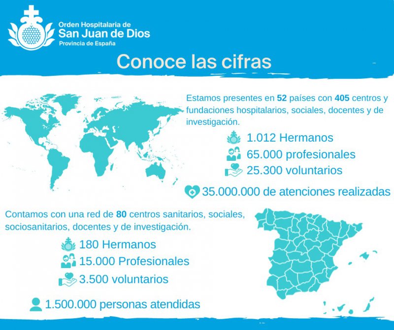 En España, la Orden Hospitalaria de San Juan de Dios cuenta con una red de 80 centros sanitarios, sociales, sociosanitarios, docentes y de investigación que atienden a casi un millón y medio de personas anualmente. Está integrada por 188 Hermanos, 15.000 profesionales, casi 3.500 voluntarios y numerosos donantes y bienhechores.
